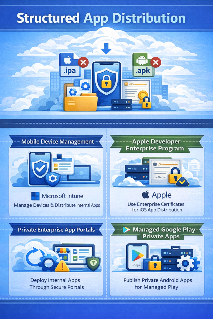 Directly installing an .ipa or .apk file, which are distribution-ready builds for iOS and Android, is not always practical or permitted for internal use. Platform policies, access control requirements, and device restrictions often make raw file installation unsuitable at scale. In addition, internal applications typically require ongoing version management, meaning users must be able to receive updates when new versions become available.