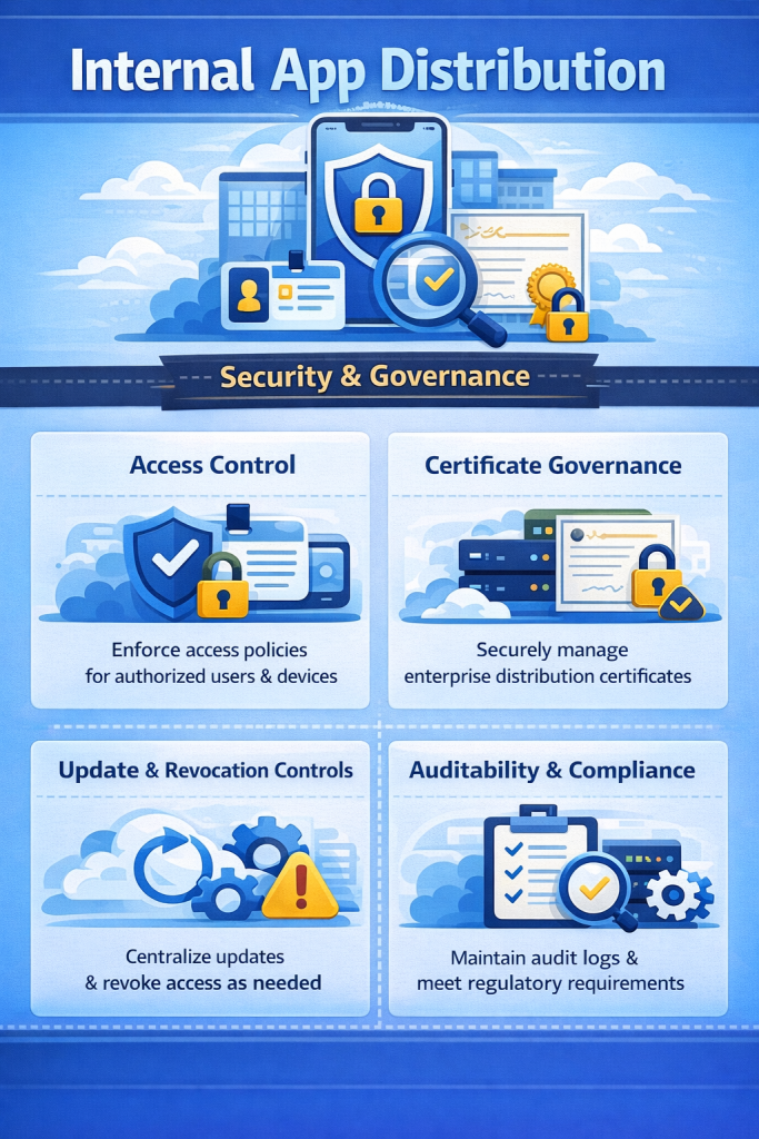 In-house app distribution requires stronger security and governance controls than public app releases or short-term tester distribution. Internal applications often support business-critical workflows and may access sensitive systems or data, making access control and lifecycle management essential. Key considerations include: